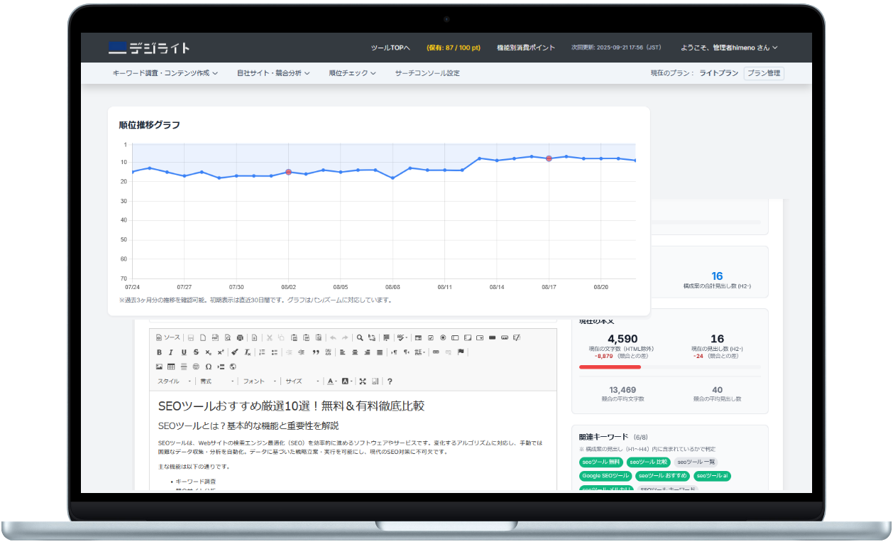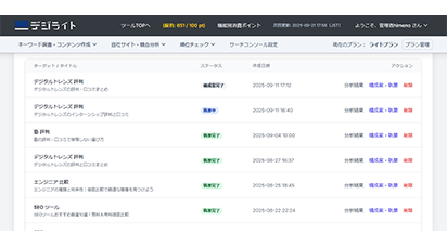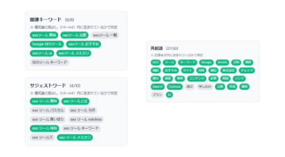 生成された記事が、対策キーワードや共起語をどの程度含んでいるかをリアルタイムでスコア化。誰が書いても一定の品質を担保できます。